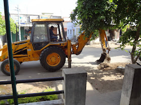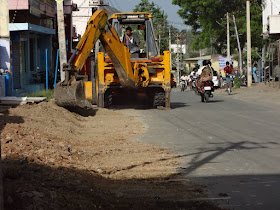 A large hydraulic bull - dozer was here this afternoon , at our village main road,with the quick road laying road rollers behind, and an army of workers.