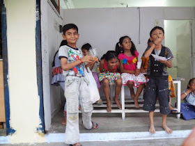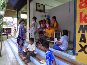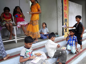 One 'o' clock was lunch, and the kids shared the break sitting among themselves and sharing their lunches , and accepting treats of cucumber and salted unripe mangoes.